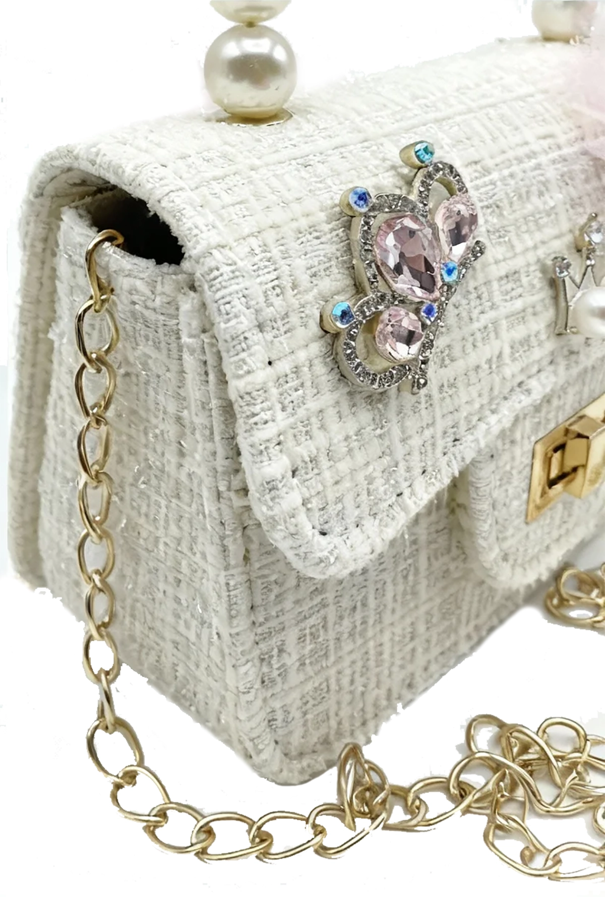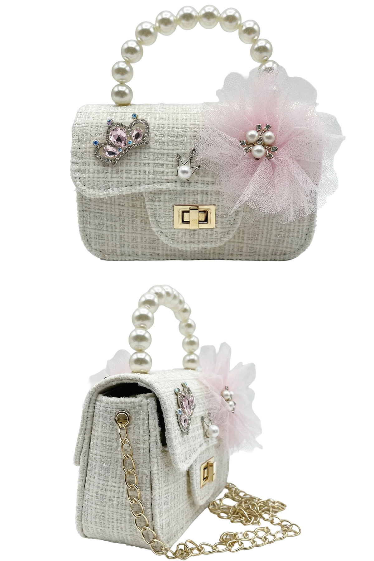 Bolso de niña beige en tweed con asa de perlas, cadena dorada y detalles de corona y flor rosa, ideal para fiesta y ocasiones especiales.