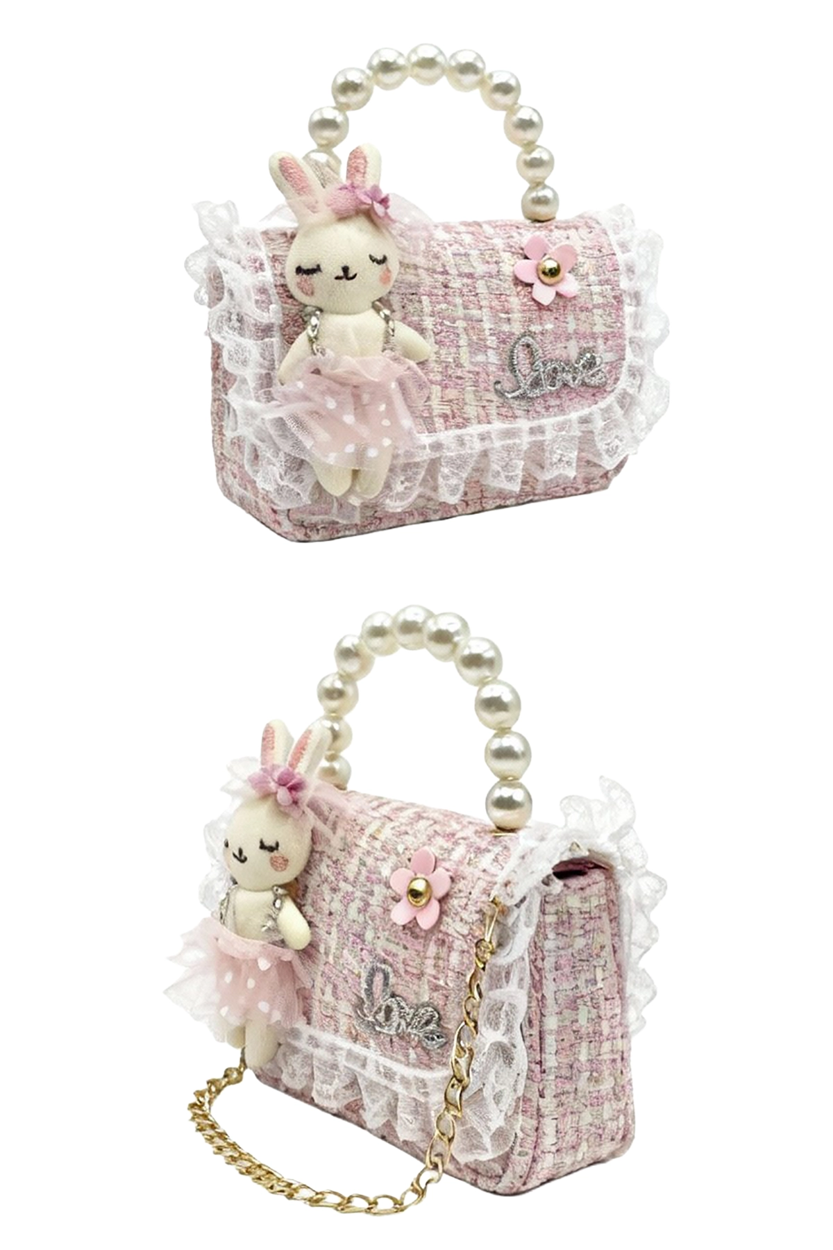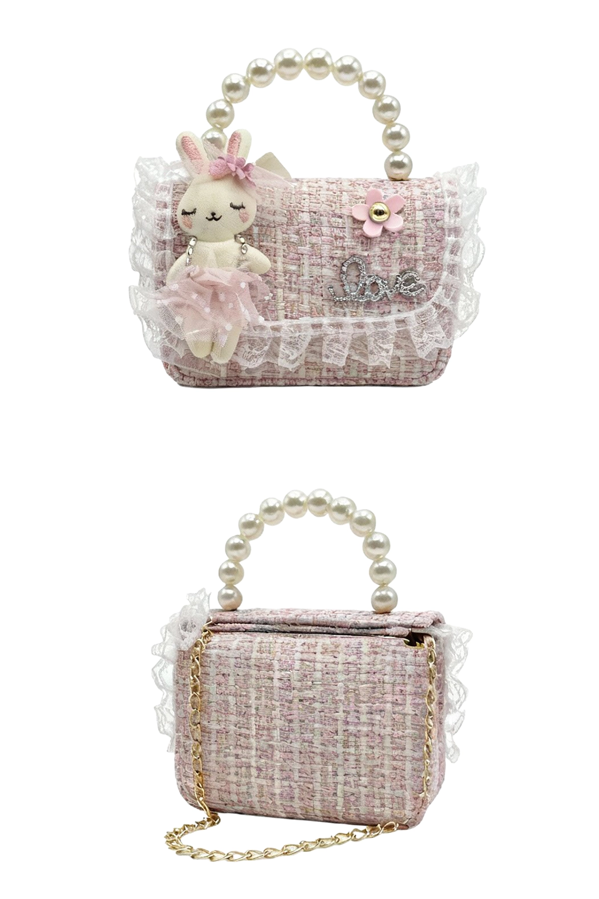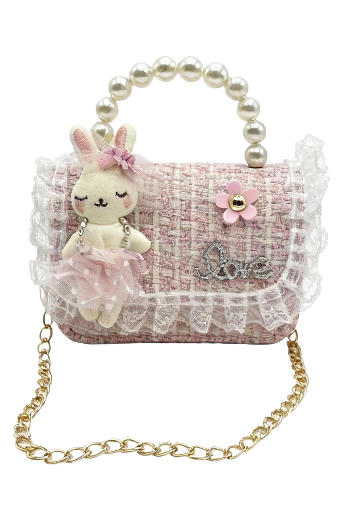 Bolso rosa para niña con diseño de conejo, asas de perlas y detalles de encaje. Un accesorio tierno y elegante, perfecto para ocasiones especiales y looks infantiles encantadores.