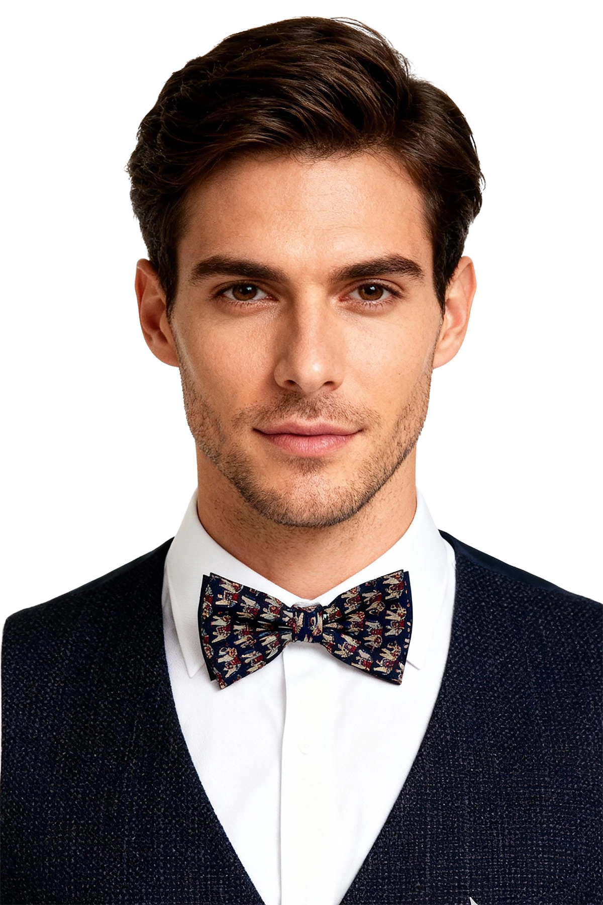 Pajarita diseño único azul marino modelo Carlos, un accesorio elegante y sofisticado con detalles circulares que aportan distinción. Ideal para bodas, fiestas y eventos especiales donde destacar con estilo propio.