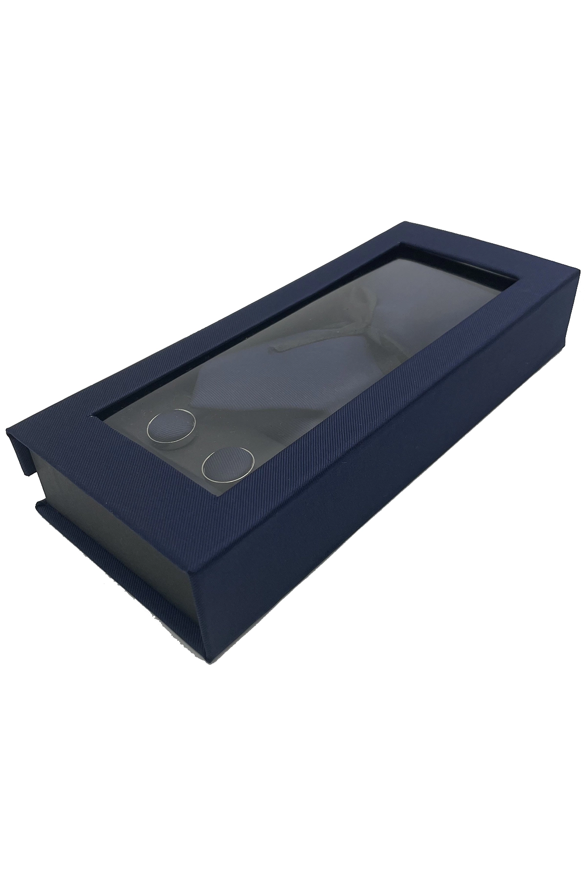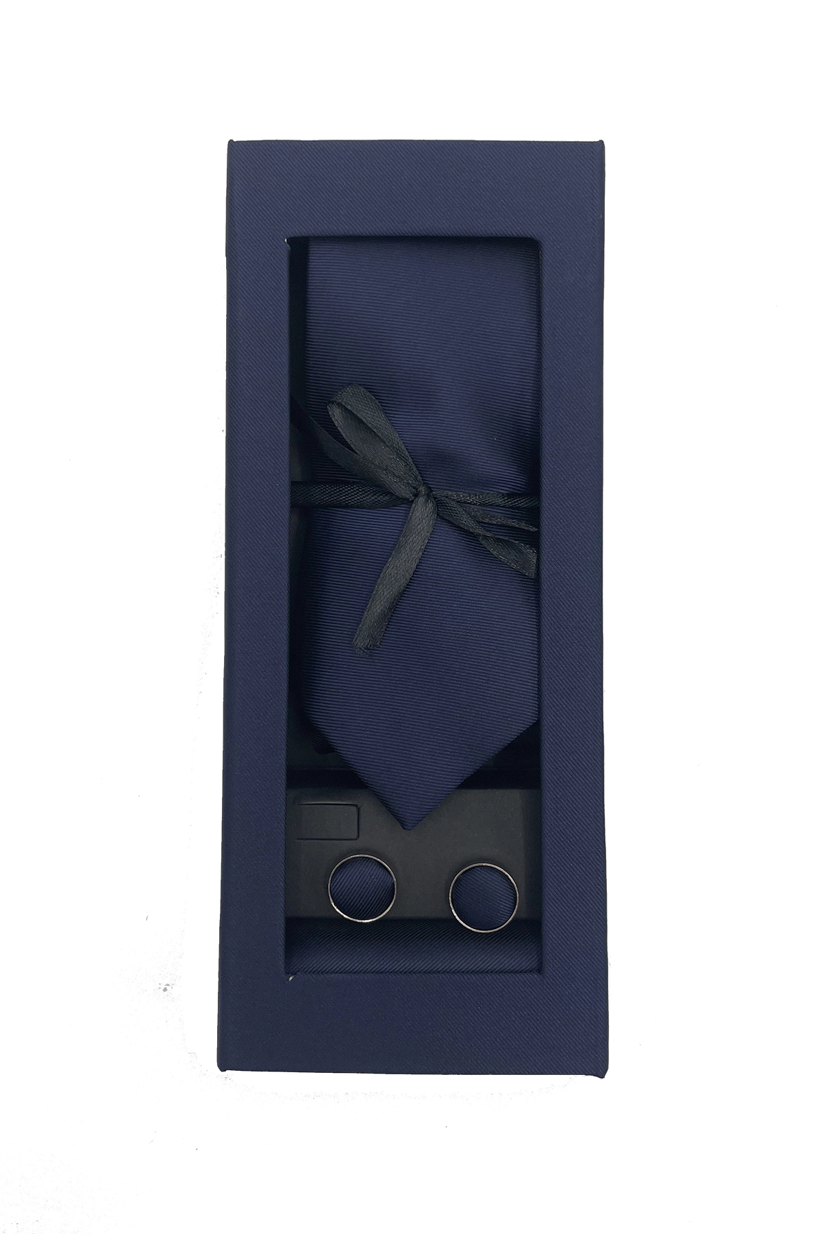Set de 3 piezas que incluye corbata, pañuelo y gemelos en un elegante tono azul marino liso, ideal para un look clásico, sobrio y sofisticado. Perfecto como detalle o regalo especial