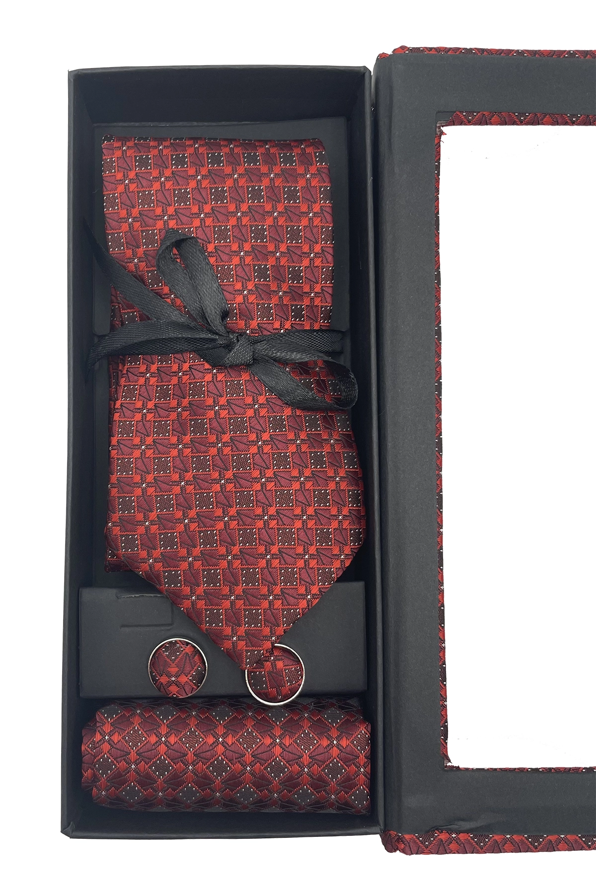 Set de corbata, pañuelo y gemelos con elegante diseño en negro con detalles rojos y plateados. Un pack regalo ideal para eventos, bodas, fiestas y ocasiones especiales