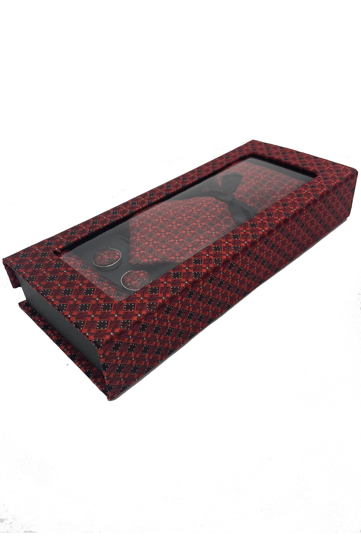 Este elegante pack regalo de 3 piezas ha sido diseñado para hombres que buscan complementar su estilo con accesorios de calidad y un toque de distinción. Incluye una corbata, un pañuelo y un par de gemelos, todos perfectamente coordinados en un atractivo diseño geométrico en tonos rojos que aporta sofisticación y personalidad a cualquier conjunto formal.