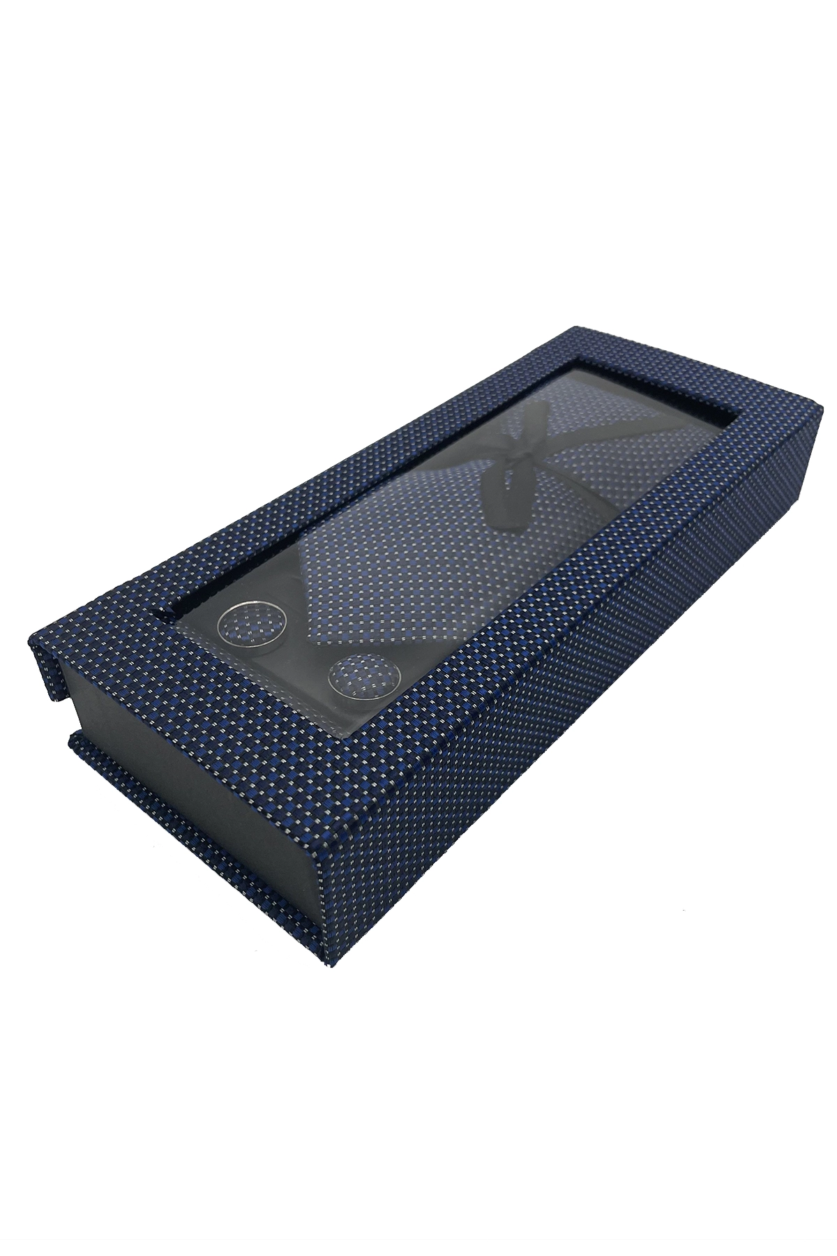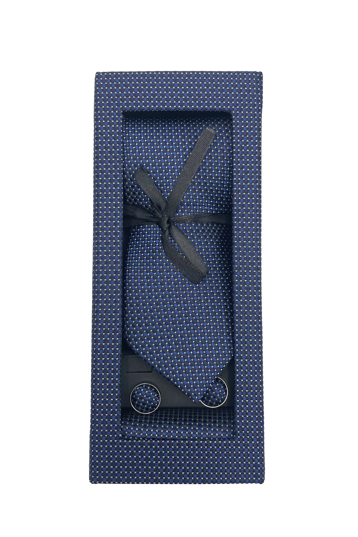 Set de 3 piezas que incluye corbata, pañuelo y gemelos, con un elegante diseño azul. Perfecto para completar un look formal o para un regalo especial.