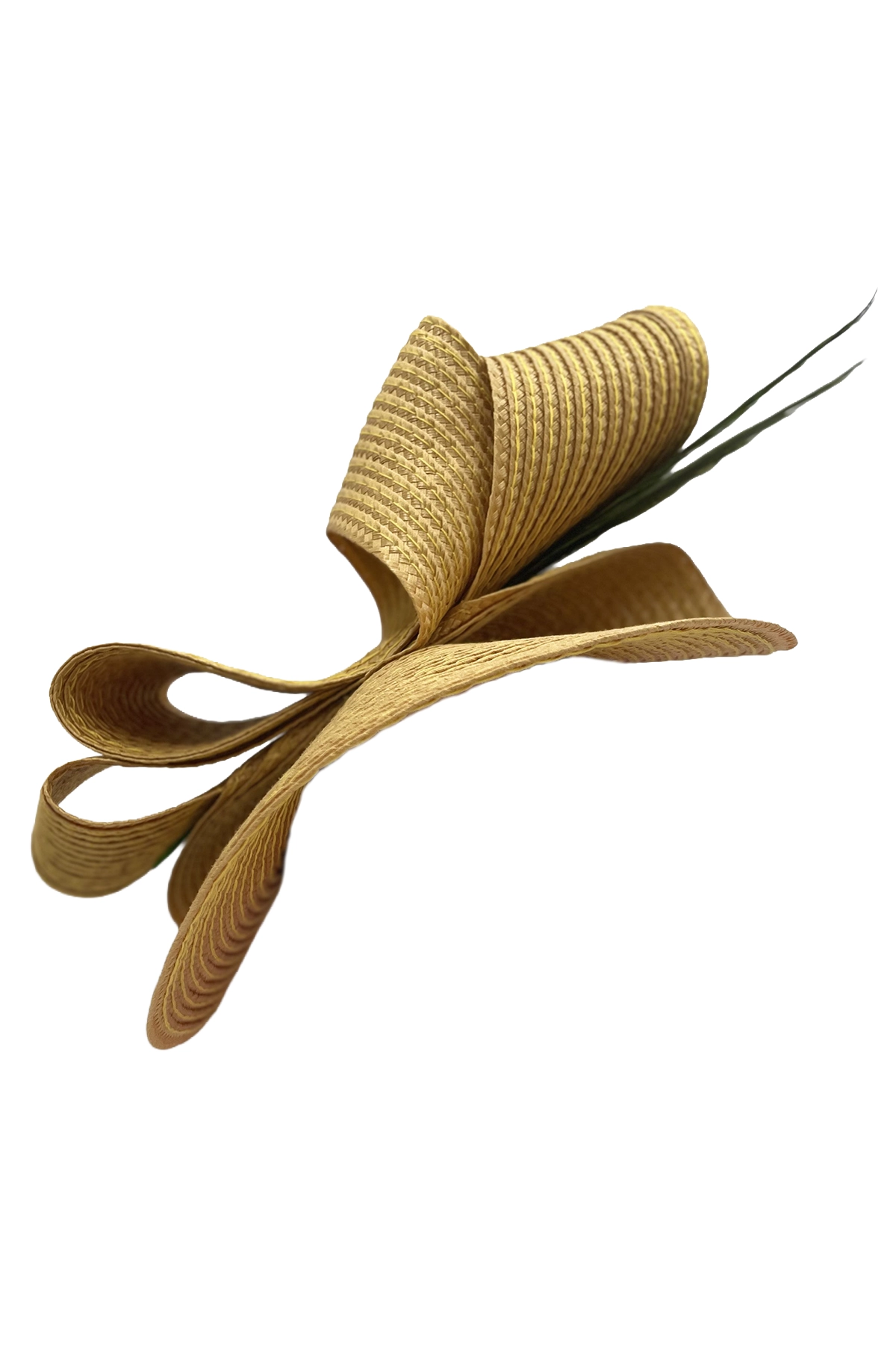 Este accesorio es una joya de la elegancia contemporánea, perfecta para una novia romántica, una invitada distinguida o una madrina con estilo. Su diseño escultórico de lazos entrelazados en rafia natural crea un juego de volúmenes equilibrado y sofisticado. La pluma en tono verde oscuro, fina y sutil, aporta un toque de movimiento y frescura, elevando el conjunto con una delicadeza exquisita.