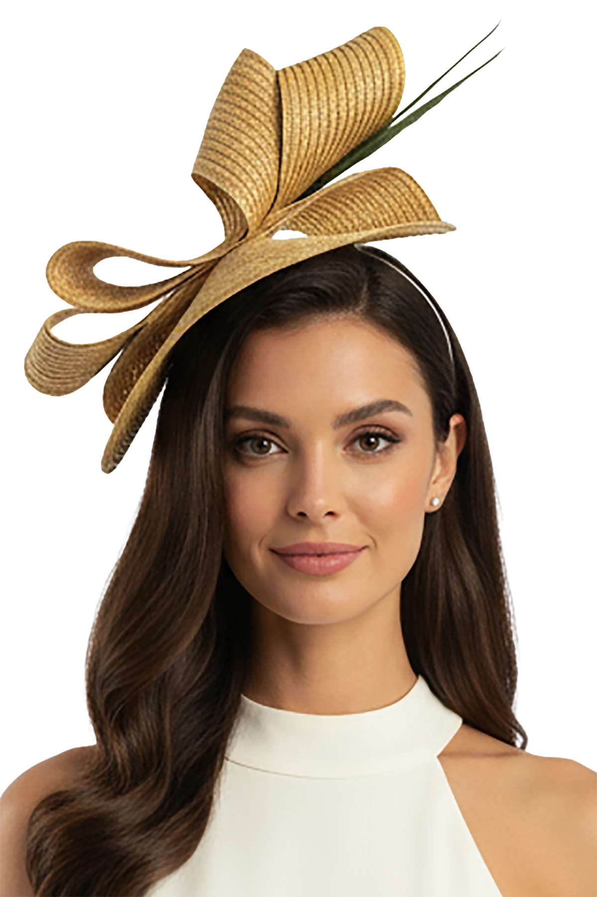 Este sofisticado tocado en color blanco destaca por su diseño escultórico elaborado con finas ondas textiles que aportan volumen, movimiento y un toque moderno. Realzado con delicadas plumas en tono verde oscuro, combina armoniosamente la suavidad de las formas con un detalle natural que añade altura y distinción.