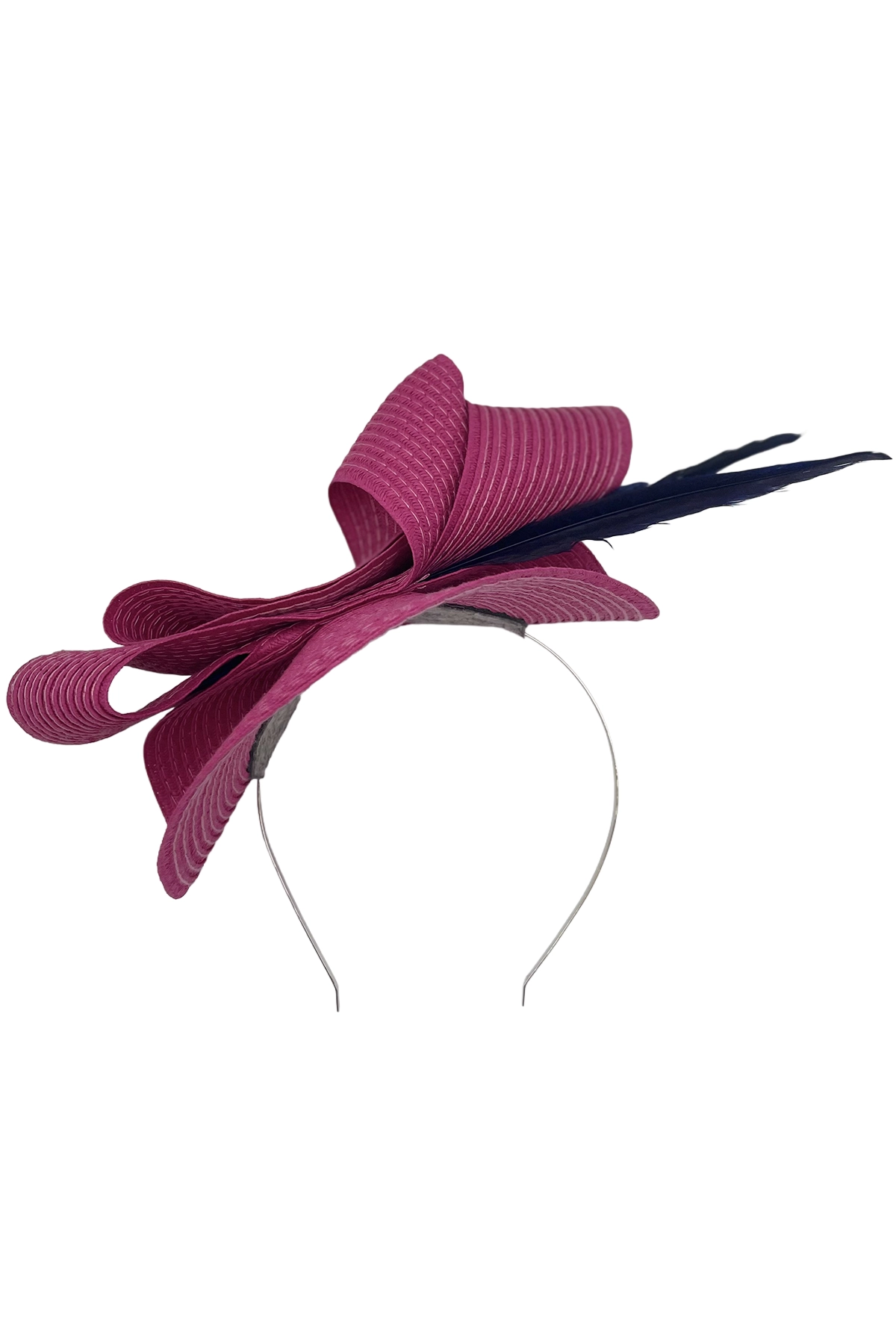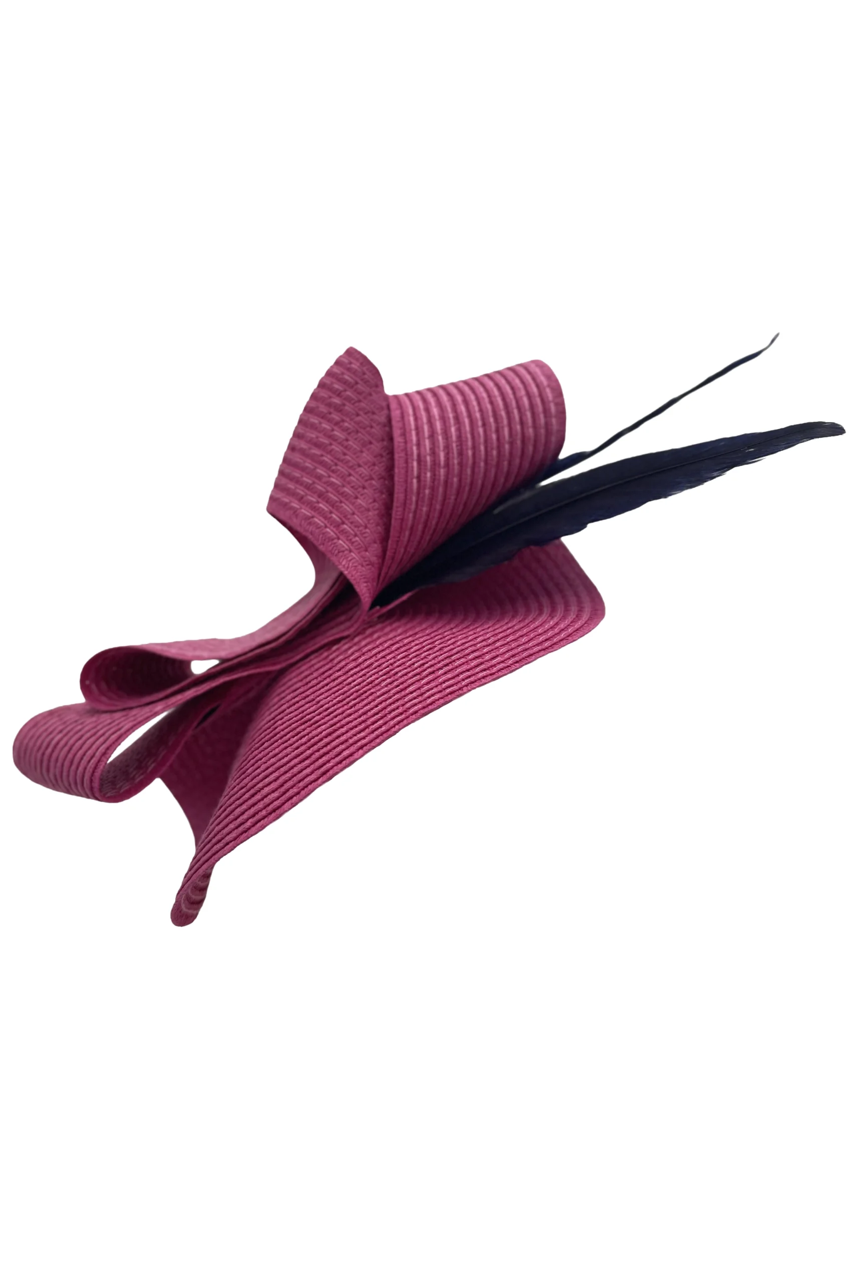 Tocado azul marino con plumas de diseño escultórico, elaborado con cinta texturizada que forma elegantes pliegues y ondas. Ideal para eventos y ocasiones especiales, aporta un toque moderno y sofisticado al look .
