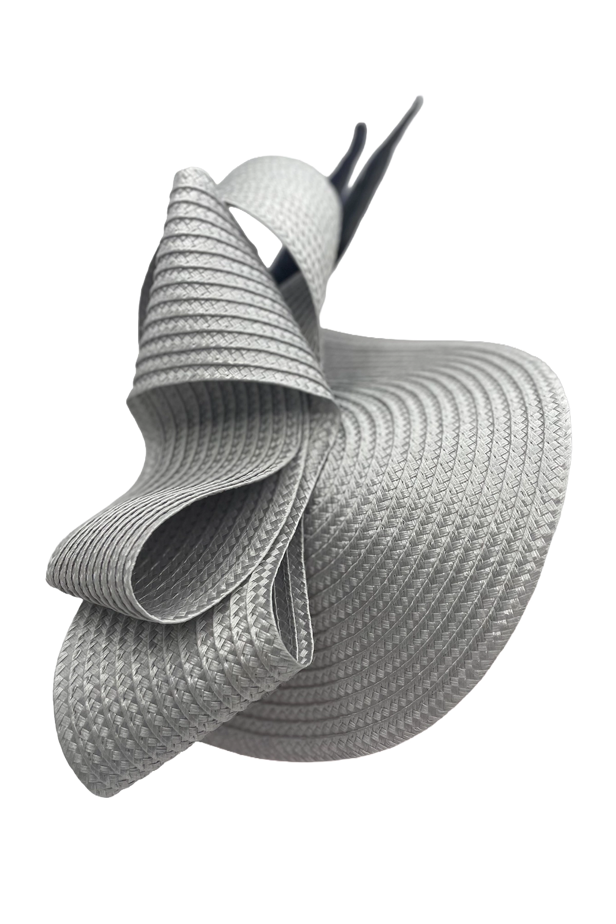 El diseño de este tocado se caracteriza por la estructura trenzada de sus lazos, elaborados con precisión y cuidado artesanal. Las formas onduladas y fluidas crean una sensación de movimiento, como si el tejido cobrara vida sobre la cabeza. Este estilo recuerda a los tocados de inspiración británica que desde hace décadas dominan los eventos de etiqueta, como las bodas reales o las carreras de Ascot, donde la moda de sombrerería alcanza su máxima expresión.