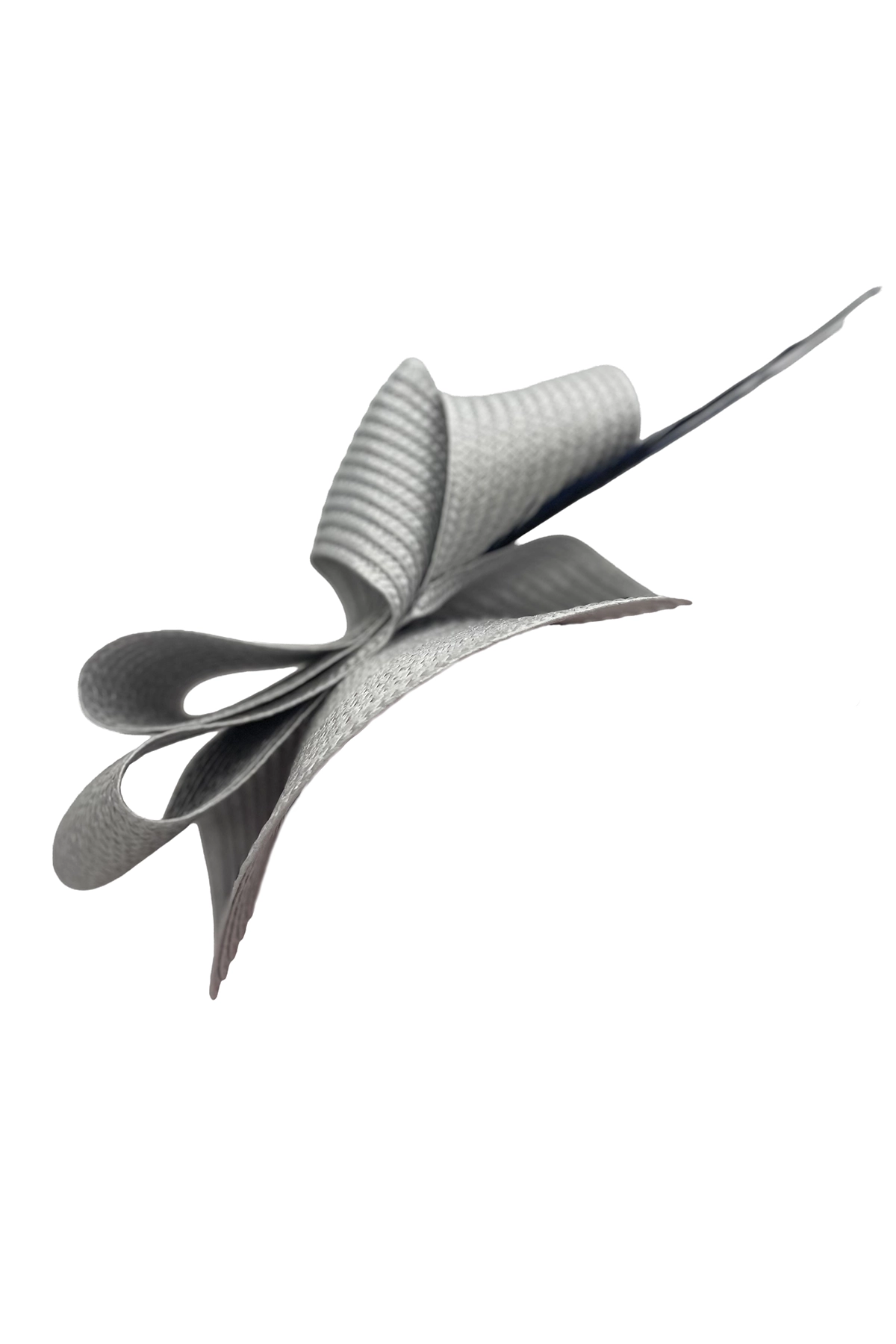 Tocado color plata con diseño de lazos trenzados y plumas, elegante y moderno, ideal para bodas, fiestas o invitadas sofisticadas