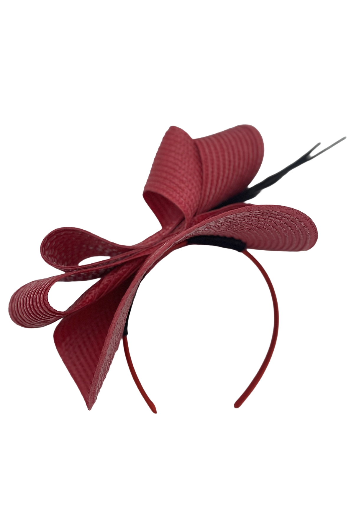 El tocado de color rojo intenso, es un diseño unico con una base de diseño curvado y textura plisada que le da volumen y movimiento. Está decorado con plumas negras que sobresalen con elegancia, aportando contraste y un toque sofisticado. Es un accesorio llamativo y moderno, ideal para eventos formales o de estilo británico, como bodas o carreras de sombreros .