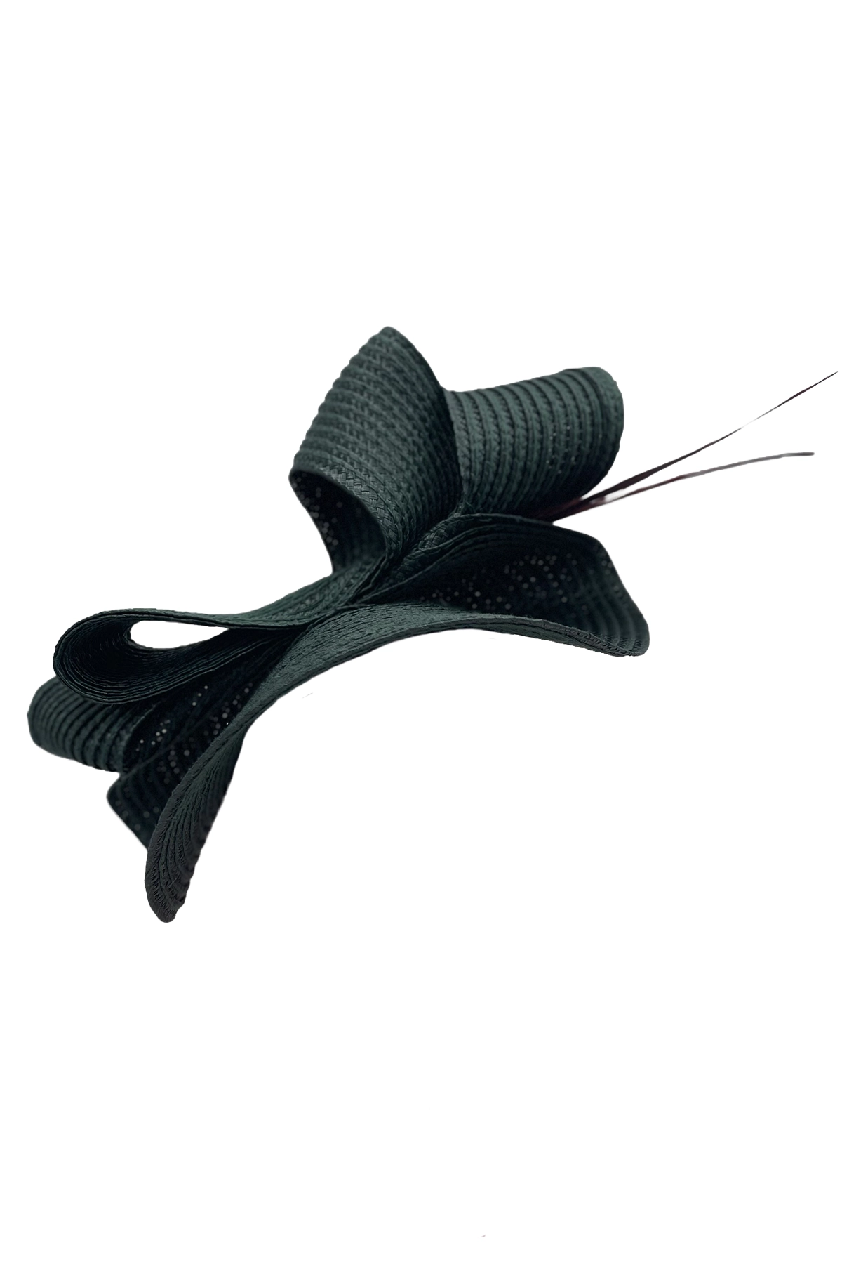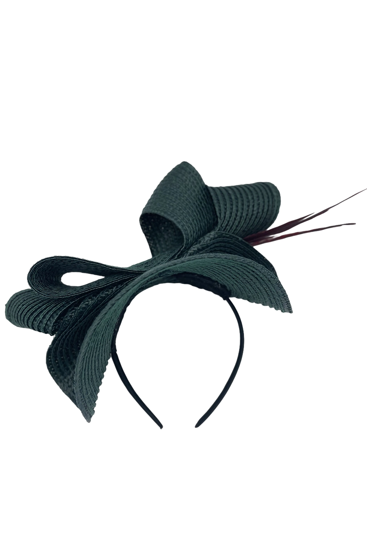 Tocado verde oscuro tipo diadema, con lazos trenzados y finas plumas decorativas, de estilo elegante y moderno.