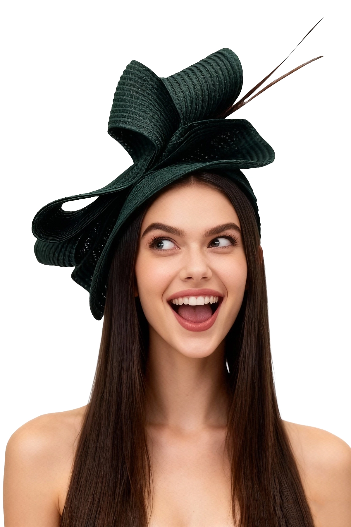 Este sofisticado tocado en color blanco destaca por su diseño escultórico elaborado con finas ondas textiles que aportan volumen, movimiento y un toque moderno. Realzado con delicadas plumas en tono verde oscuro, combina armoniosamente la suavidad de las formas con un detalle natural que añade altura y distinción.