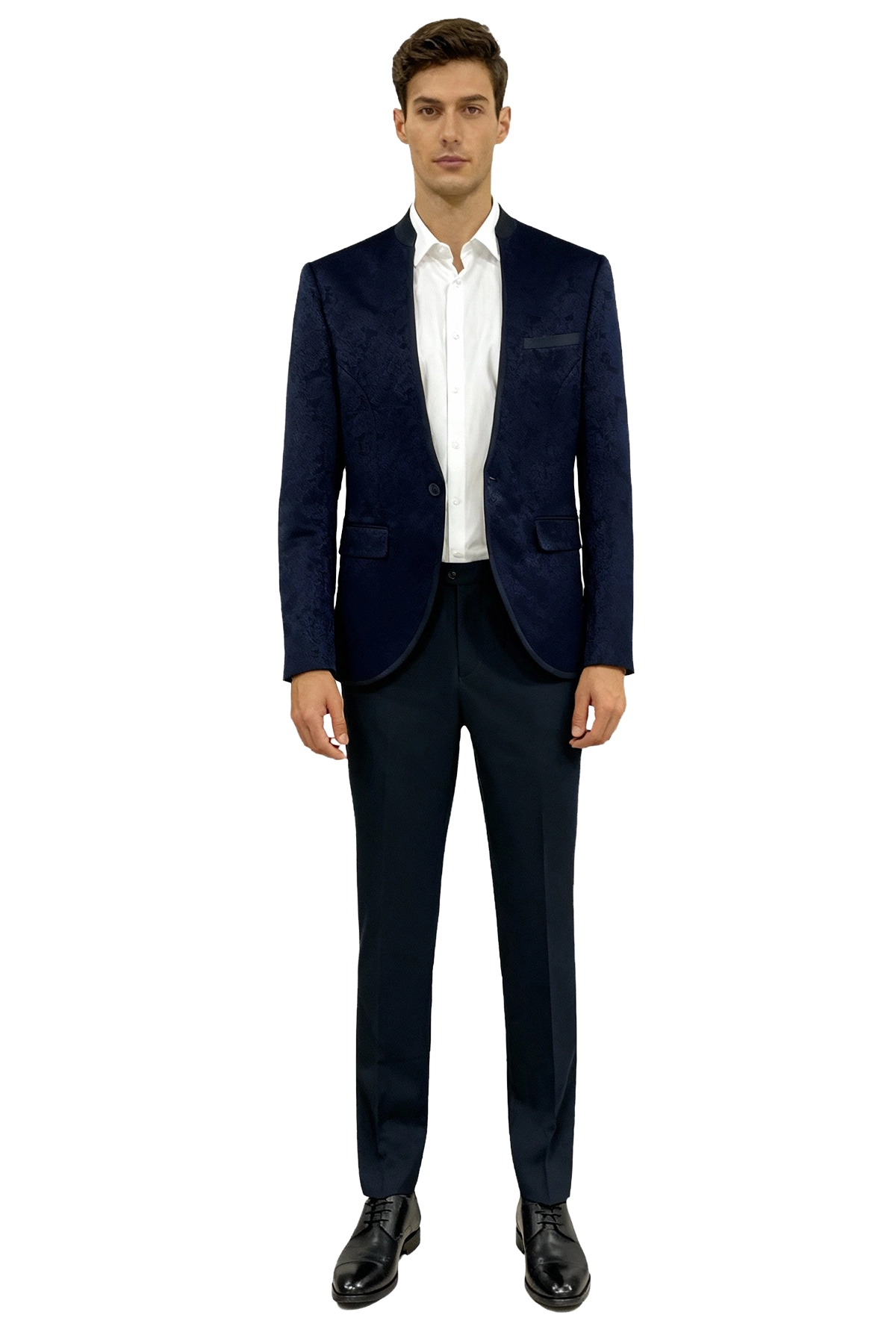 Traje de novio con brocado azul marino modelo Luis, elegante y sofisticado, ideal para bodas y eventos formales gracias a su diseño moderno y acabado distintivo.