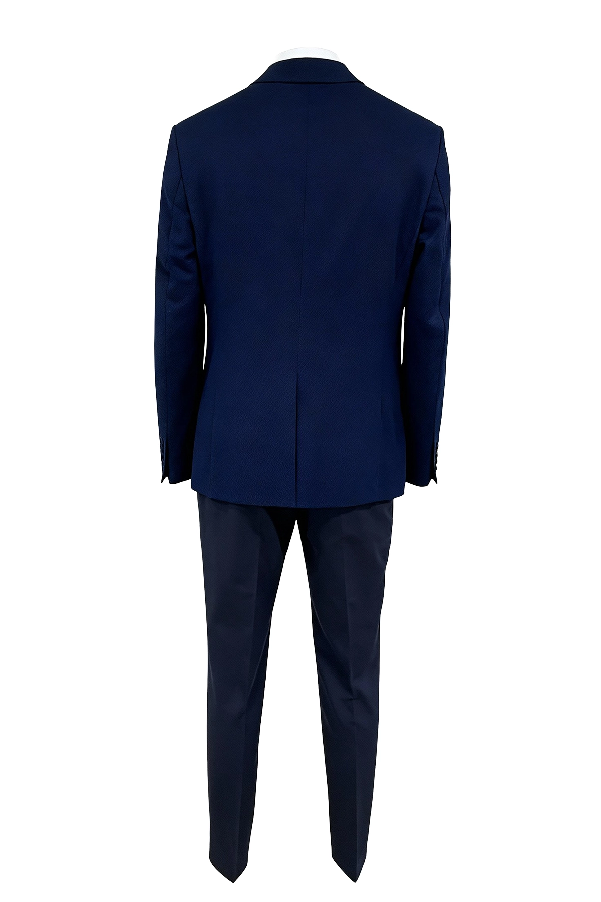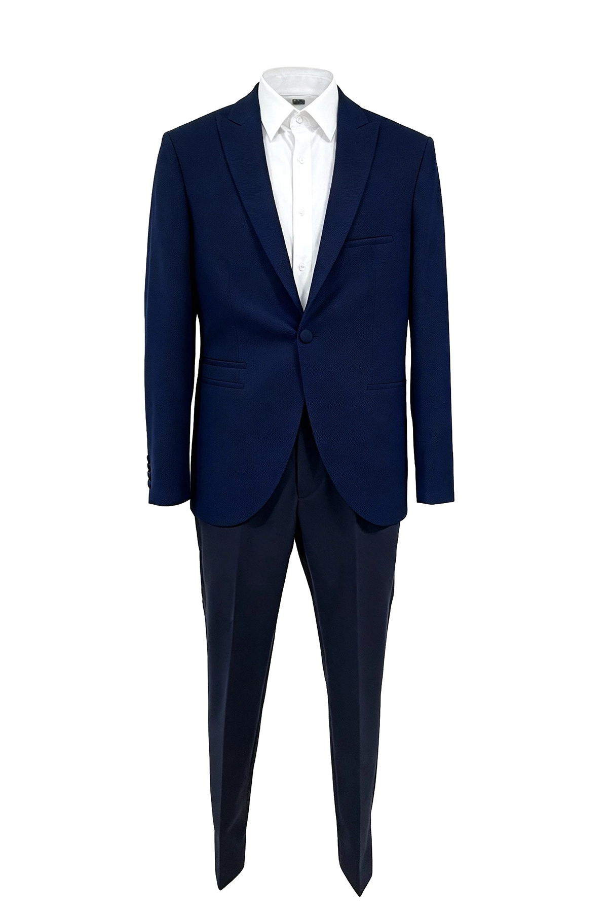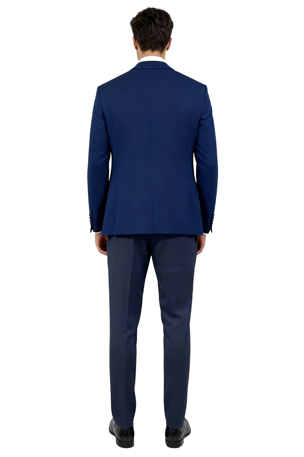 Traje de novio con brocado azul marino modelo Luis, elegante y sofisticado, ideal para bodas y eventos formales gracias a su diseño moderno y acabado distintivo.