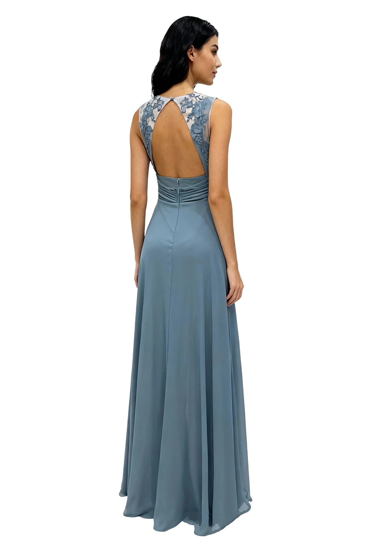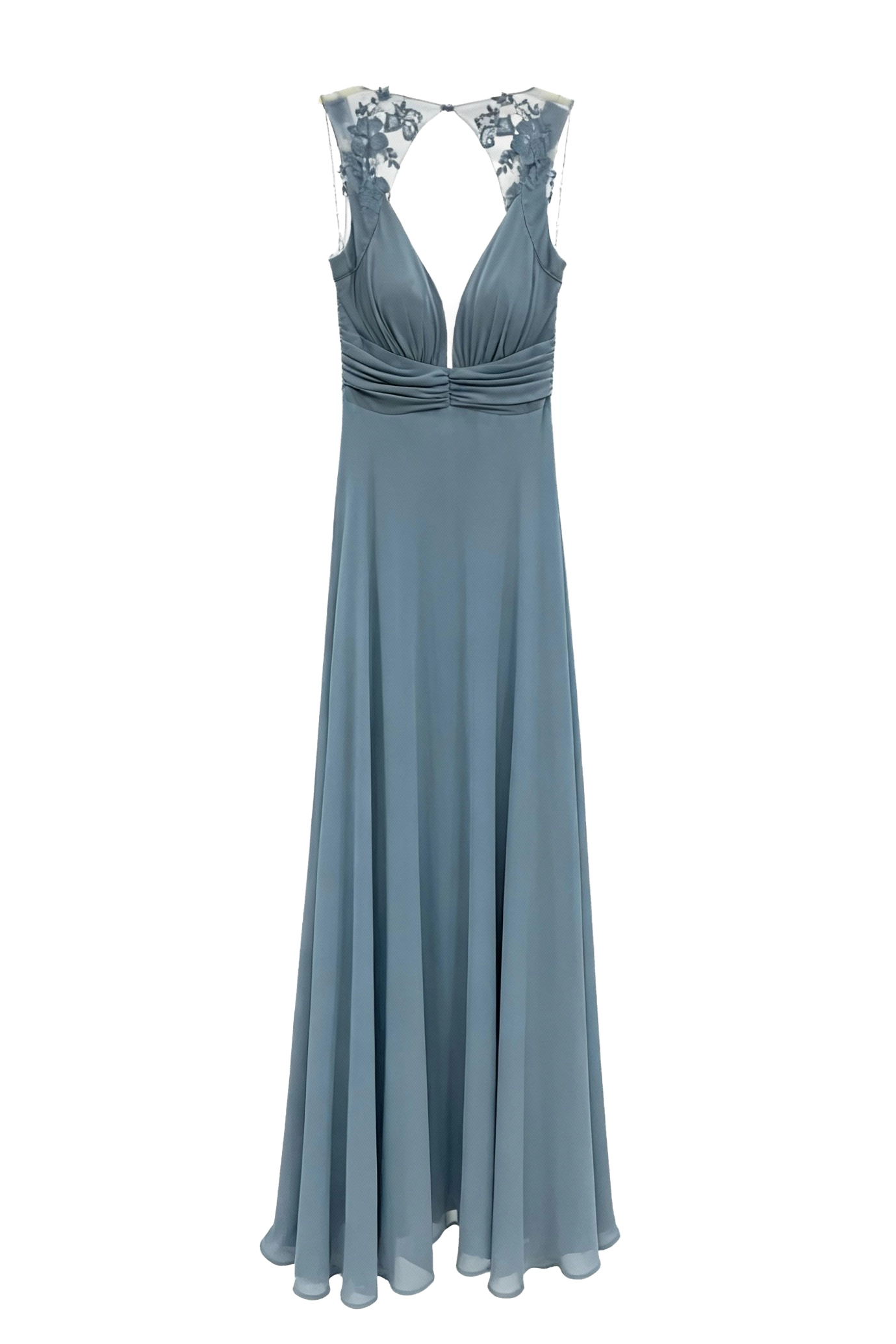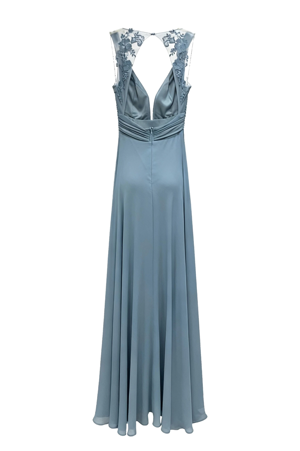 Aunque es un vestido largo sin manga, su diseño ofrece un escote profundo y elegante que estiliza la figura y realza la feminidad con sutileza. La zona del torso está cuidadosamente fruncida para aportar estructura, mientras que la falda fluida cae de manera natural, permitiendo un movimiento cómodo y armonioso en cada paso. Esta combinación de líneas suaves y acabados delicados garantiza un resultado favorecedor en todo tipo de siluetas.