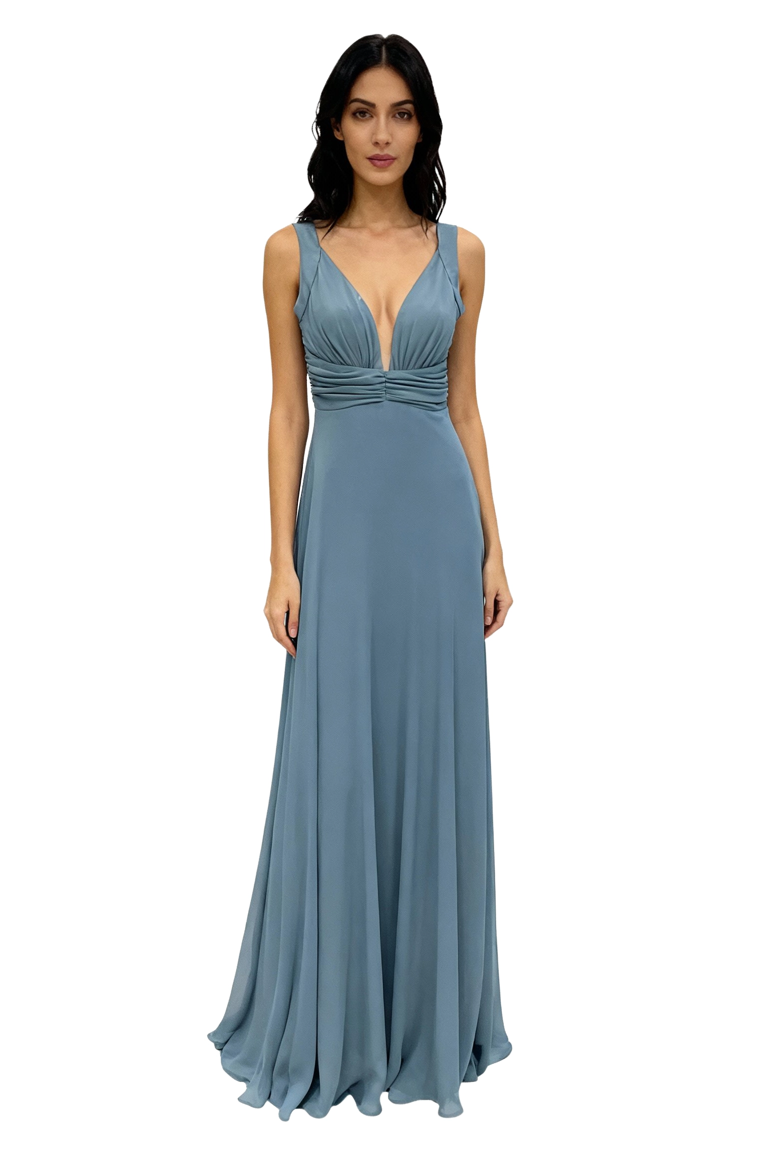 Vestido largo color gris petróleo modelo Gloria, elegante y fluido, con escote profundo y caída suave ideal para invitada, madrina o cualquier evento especial.