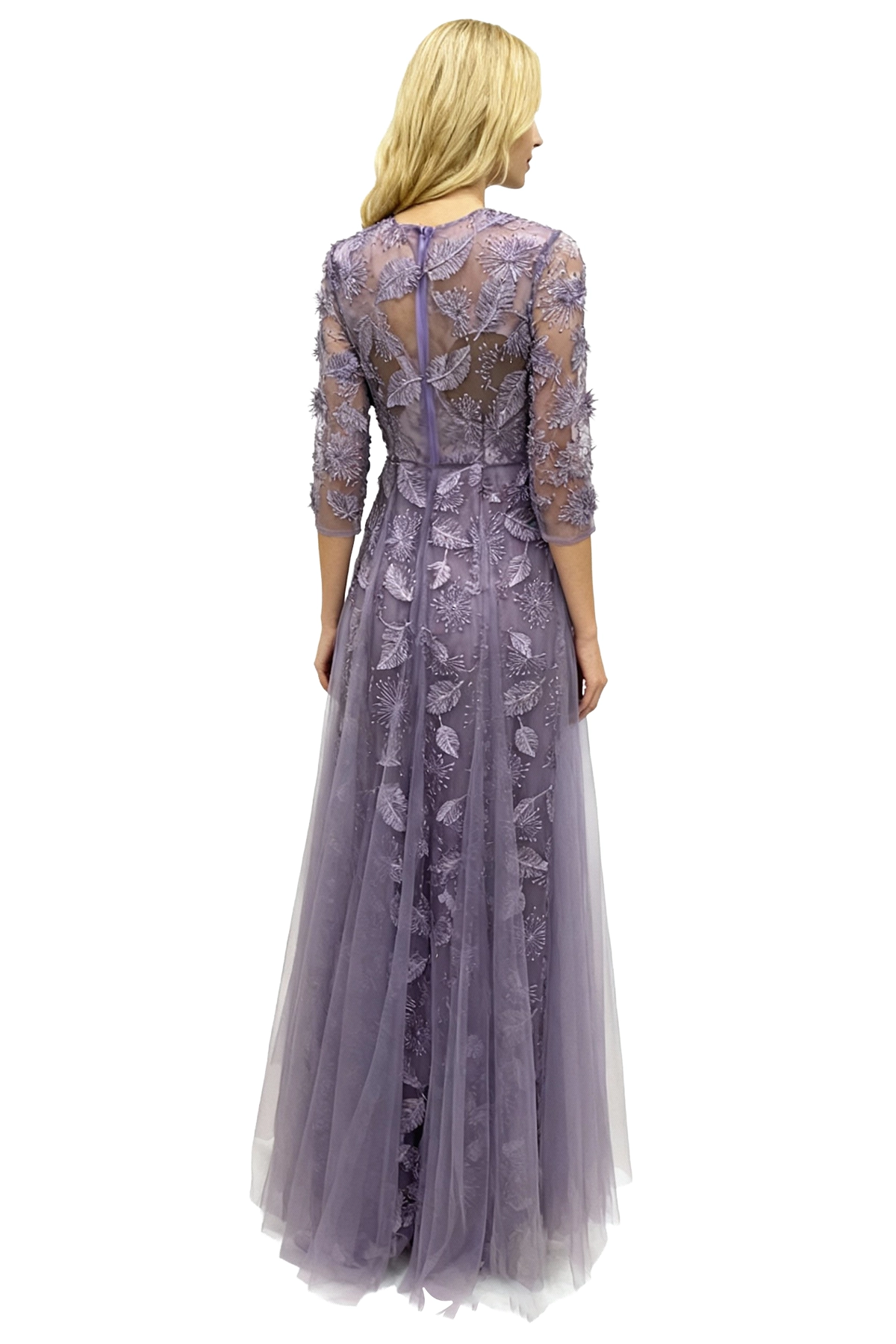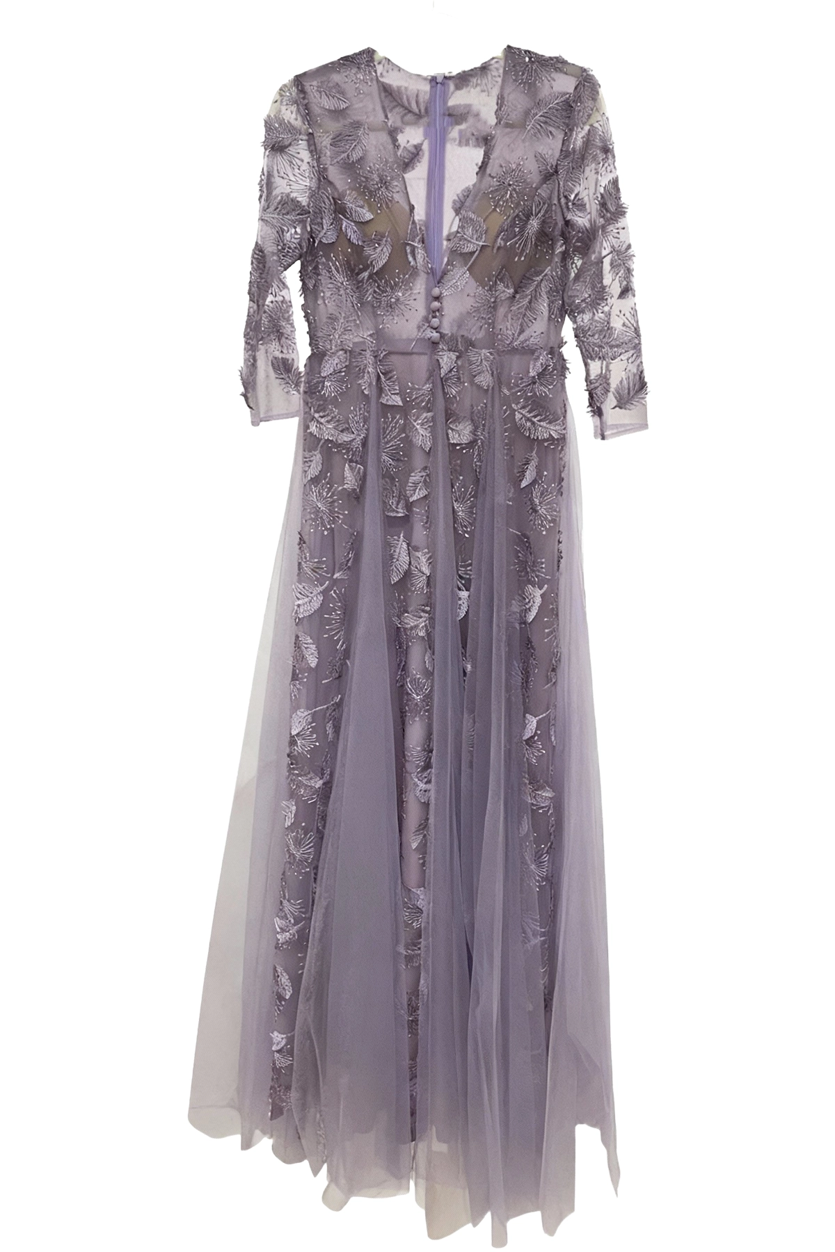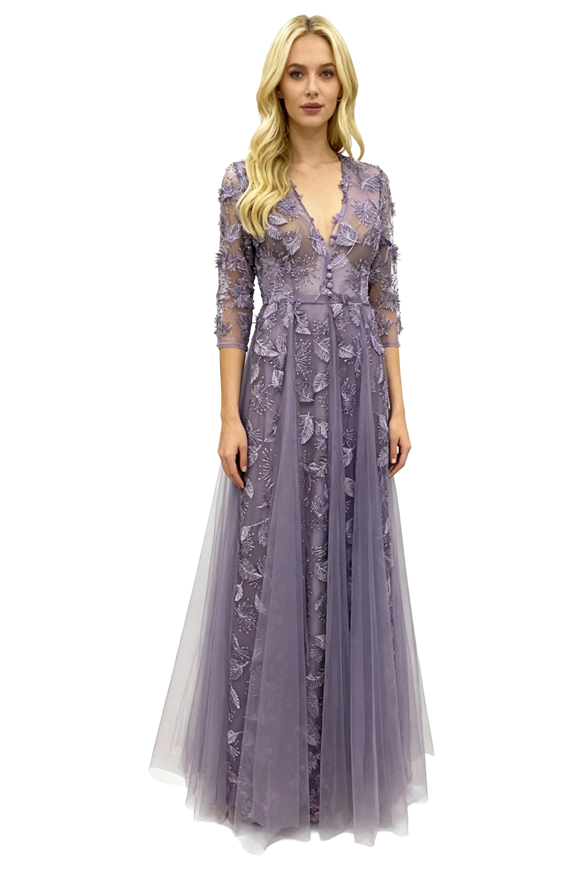 Vestido largo lila con encaje floral y falda de tul, ideal para eventos elegantes. Diseño con escote profundo y mangas tres cuartos que aportan sofisticación y delicadeza.